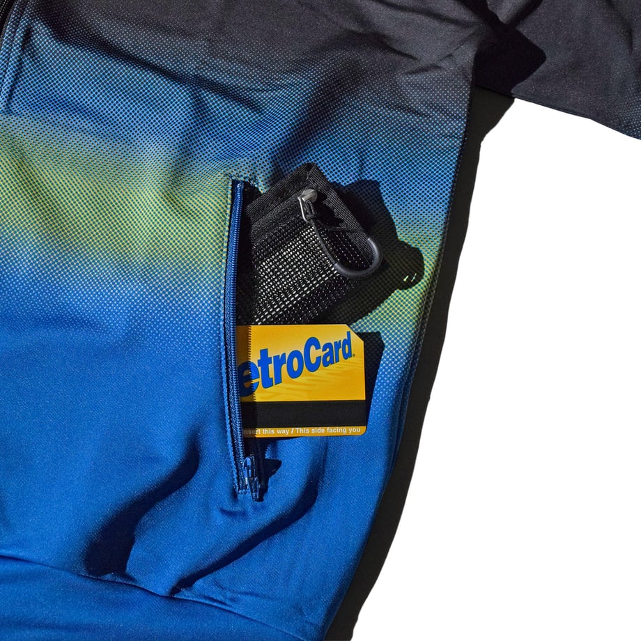 鮮やかな色あいのグラデーションカラーが美しい、ダブルジップを搭載したトラックスーツです。